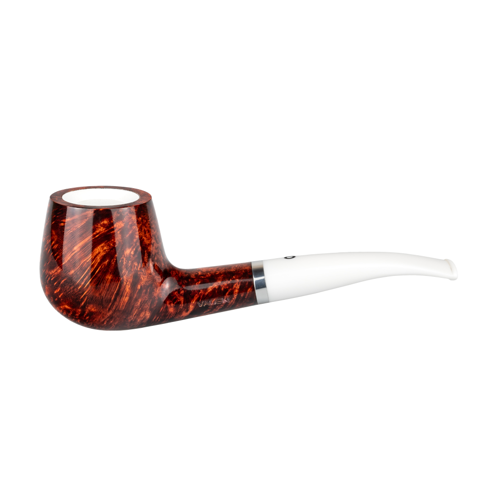 The Vauen Maris 740 Pipe impresses with its polished reddish-brown briar body, beautifully contrasted by the white acrylic mouthpiece and the matching inner lining. The elegant color harmony evokes the image of “Maris, the white goddess” – timeless and refined. The Army Mount mouthpiece connection adds a distinctive finishing touch to this elegant creation.