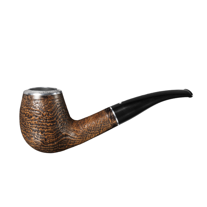 The Vauen Maximus 572 Sandblasted Pipe is a bold and elegant creation that combines modern design with refined craftsmanship. Its deep sandblasted briar surface reveals the natural grain texture, providing a striking contrast to the metallic elements that define this model’s character.